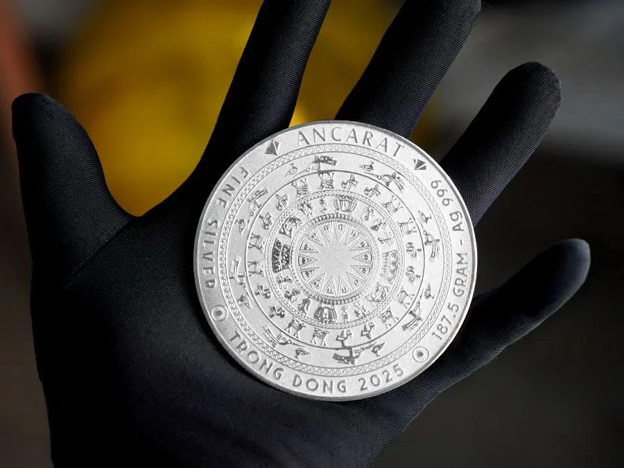 Bạc trống đồng Ancarat tái hiện huyền thoại Đông Sơn thông qua công nghệ đúc bạc hiện đại kết hợp thủ công truyền thống, tạo nên bề mặt ánh bạc lung linh mà vẫn giữ hồn cổ xưa.