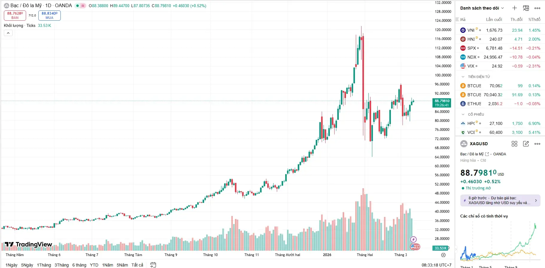 Biểu đồ kỹ thuật cho thấy bước nhảy vọt của giá bạc quốc tế trong phiên giao dịch ngày 11/03, chịu tác động trực tiếp từ căng thẳng địa chính trị tại Trung Đông.