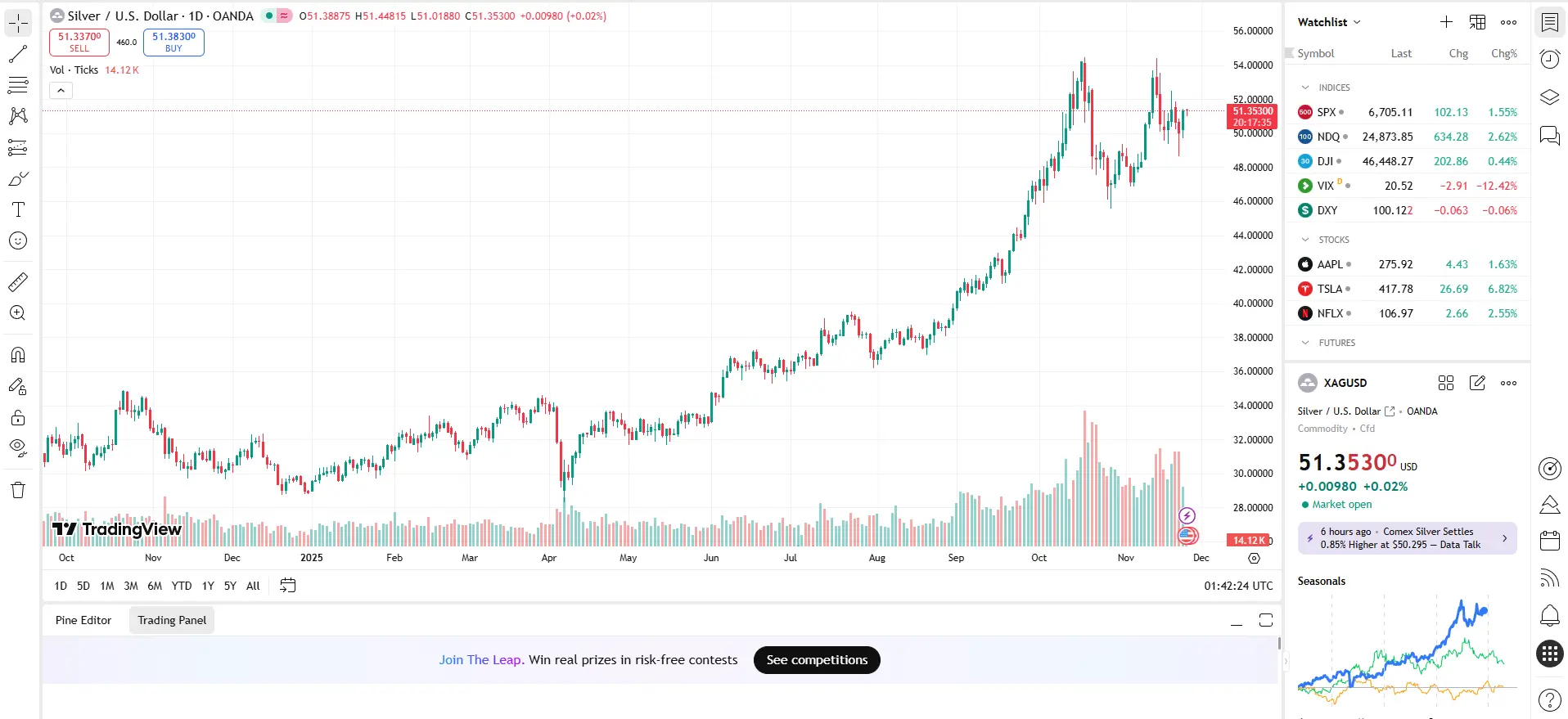 Giá bạc hôm nay 24h 25/11 mở đầu tuần bằng một phiên giao dịch thắng lợi. Giá bạc hiện nay trên thị trường quốc tế đã vượt qua mọi nghi ngờ, giao dịch mạnh mẽ quanh ngưỡng $51.35/ounce.